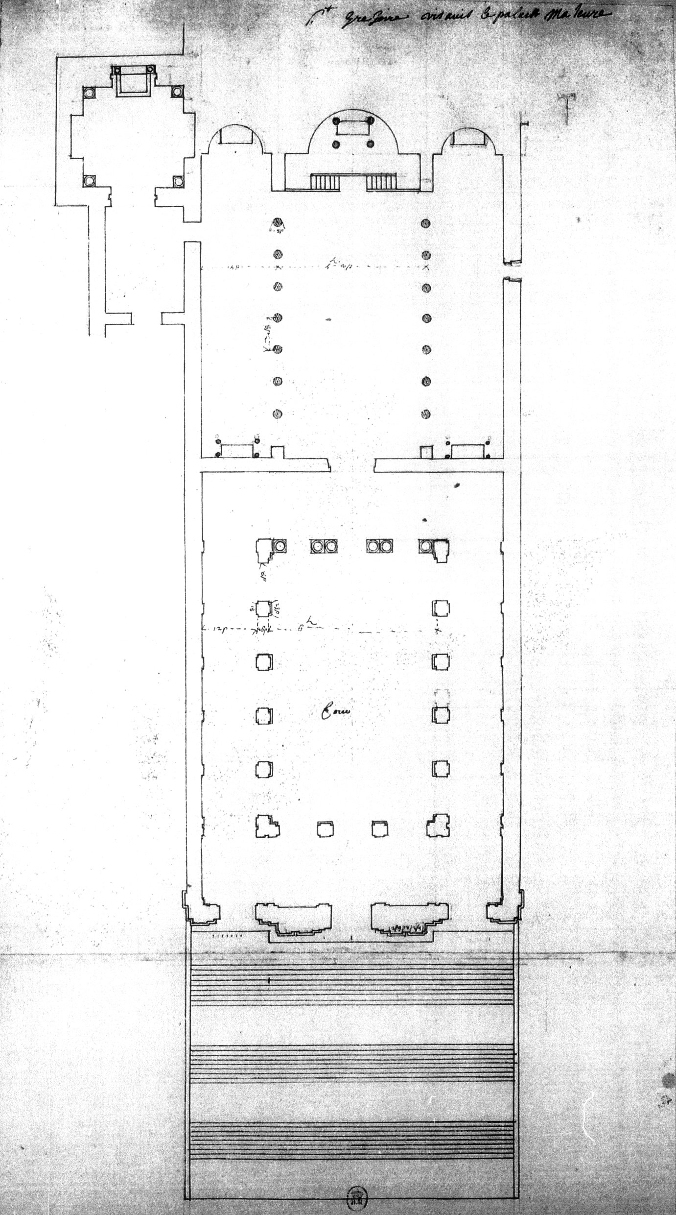 Rom, S. Gregorio al Celio, Zustand des 17. Jahrhunderts. Grundriss von 1689 mit den um die Schaftbreite verlängerten Säulenabständen und ergänzt durch das achte Säulenpaar (Senekovic)