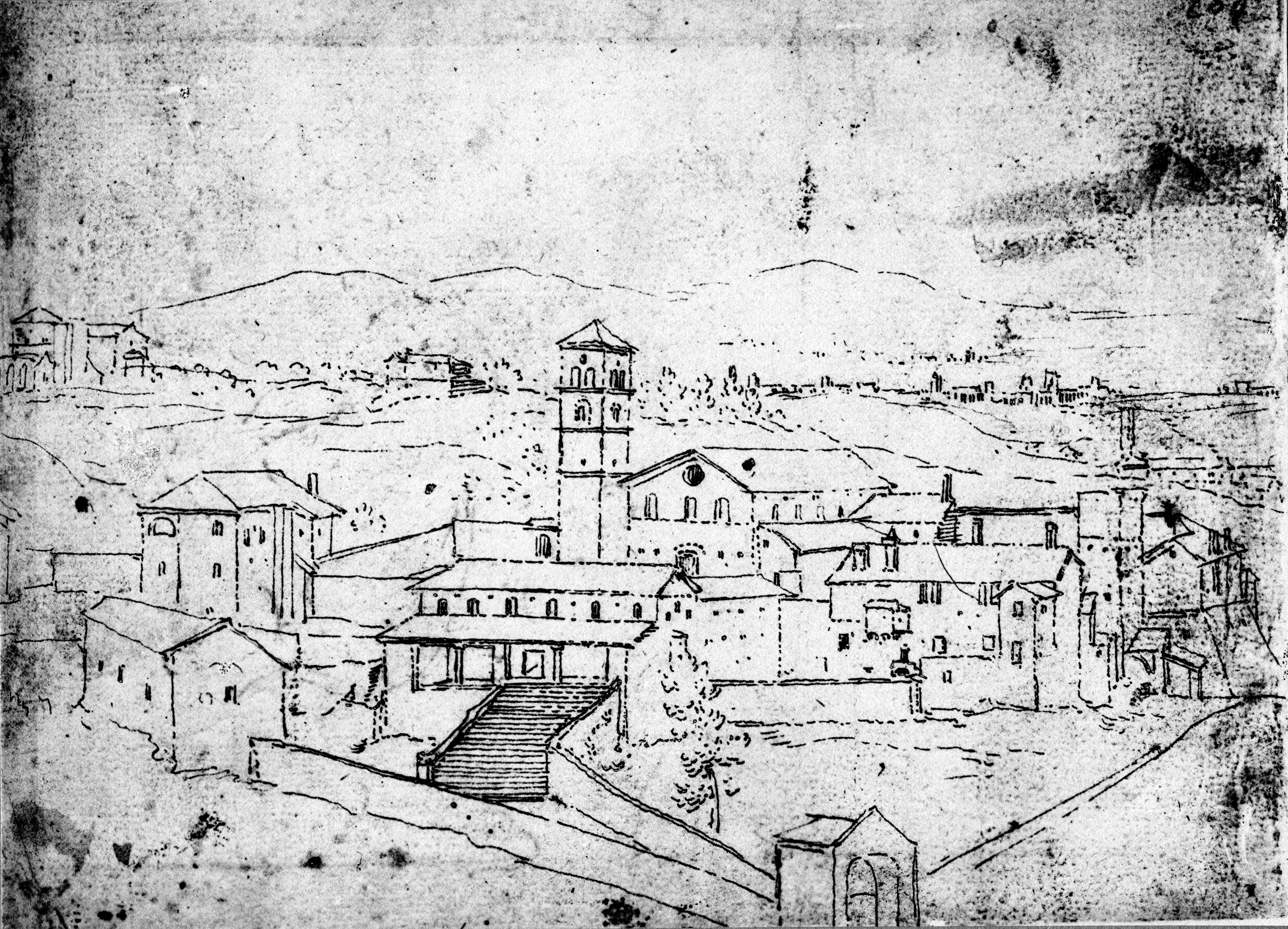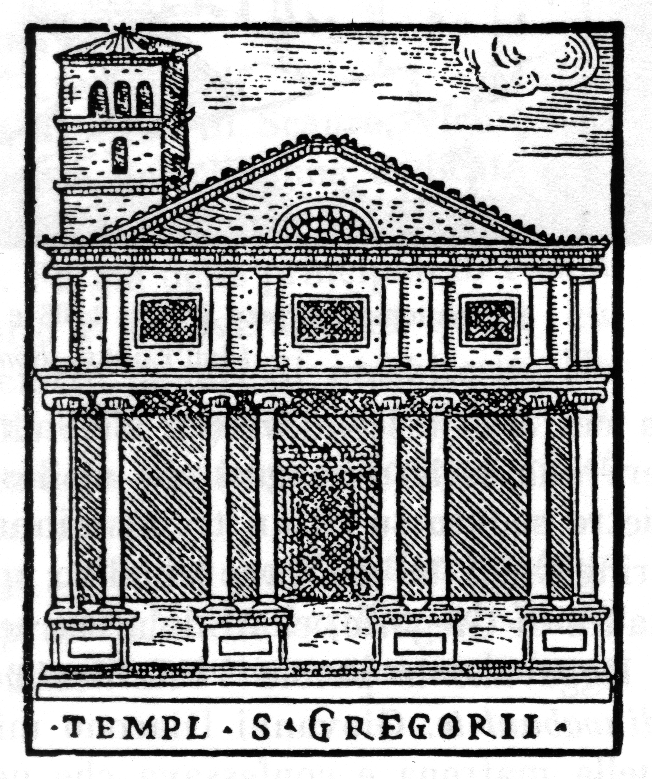 Rom, S. Gregorio al Celio, Kirche und Klosterkomplex. Ansicht von Nordosten, Zeichnung des Anonymus Fabriczy um 1572-77 (nach Egger, Veduten I, Taf. 90)