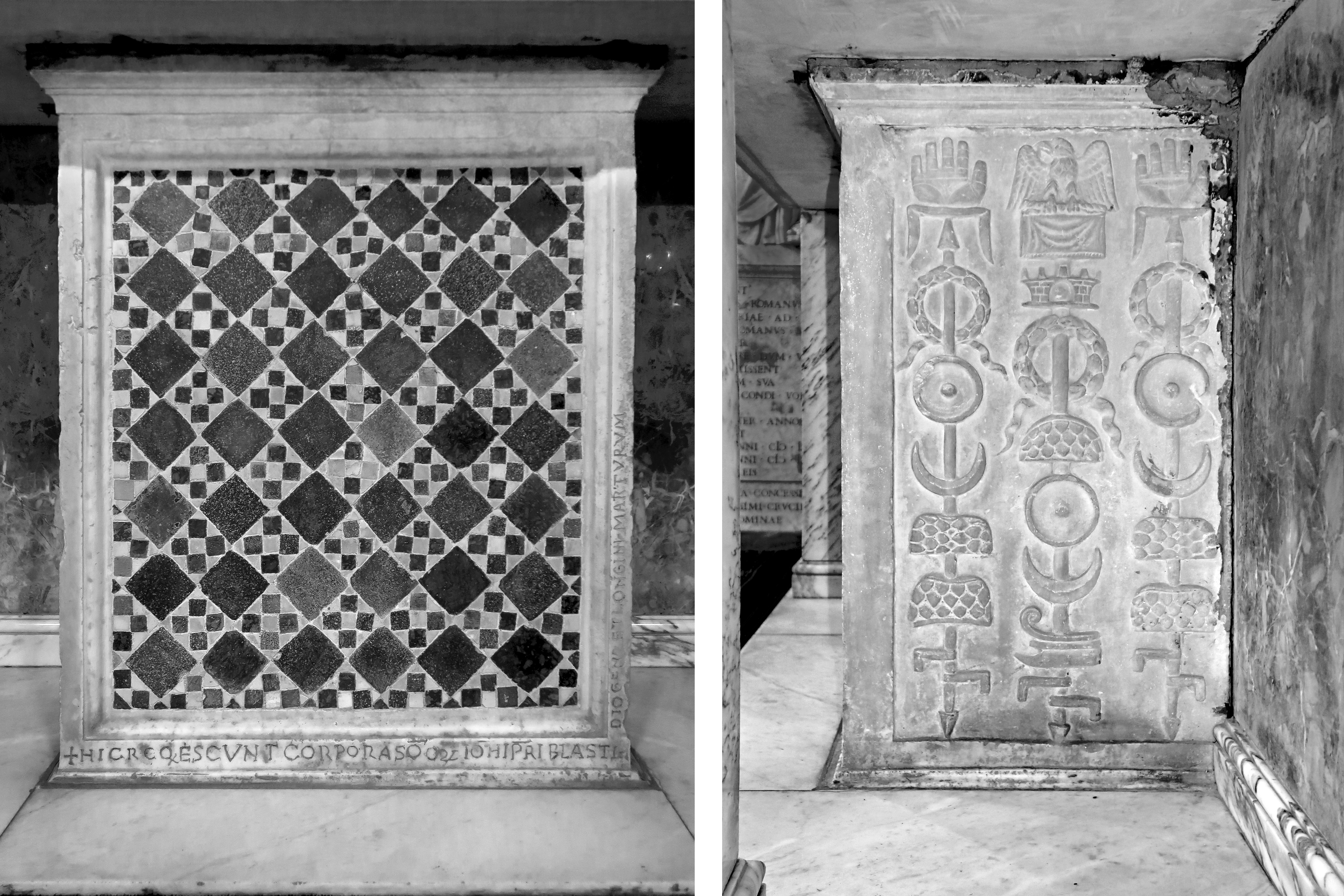 Underneath the present church of S. Marcello that was rebuilt in the 16th century, an archaeological excavation (1990-2001) identified the Late Antique basilica and its medieval transformations. S. Marcello is located in an urban area where the street level rose sharply after Antiquity. Around 1100, the floor of the church was raised by about 85 cm and two apsidioles were added at the ends of the aisles. Scanty remains of the new pavement in cosmatesque opus sectile have been preserved. An ancient cippus with opus sectile decoration on the front and an inscription mentioning the relics of St. John, St. Blasto, St. Diogenes and St. Longinus also belong to this same phase. In the second half of the 12th century, the church was extended by c. 7 m towards the west with the addition of a transept and an apse on the central axis, while two smaller apses were erected at the south and north ends of the transept. The floor level of the new transept was about 140-170 cm higher than that of the nave. Other furnishings that one would expect in a 12th-century church, such as a Schola Cantorum or an altar ciborium, are not documented, although their existence is probable. Lastly, a poorly documented construction phase took place at the end of the 15th century, and a great fire in 1519 almost completely destroyed the Late Antique church. The new building, with a single nave and side chapels, received a new façade facing Via Lata and a new apse to the east; it was then rotated 180° from the previous church. This building in its 18th-century form, with a Baroque façade from the 17th century, has been preserved to the present day.