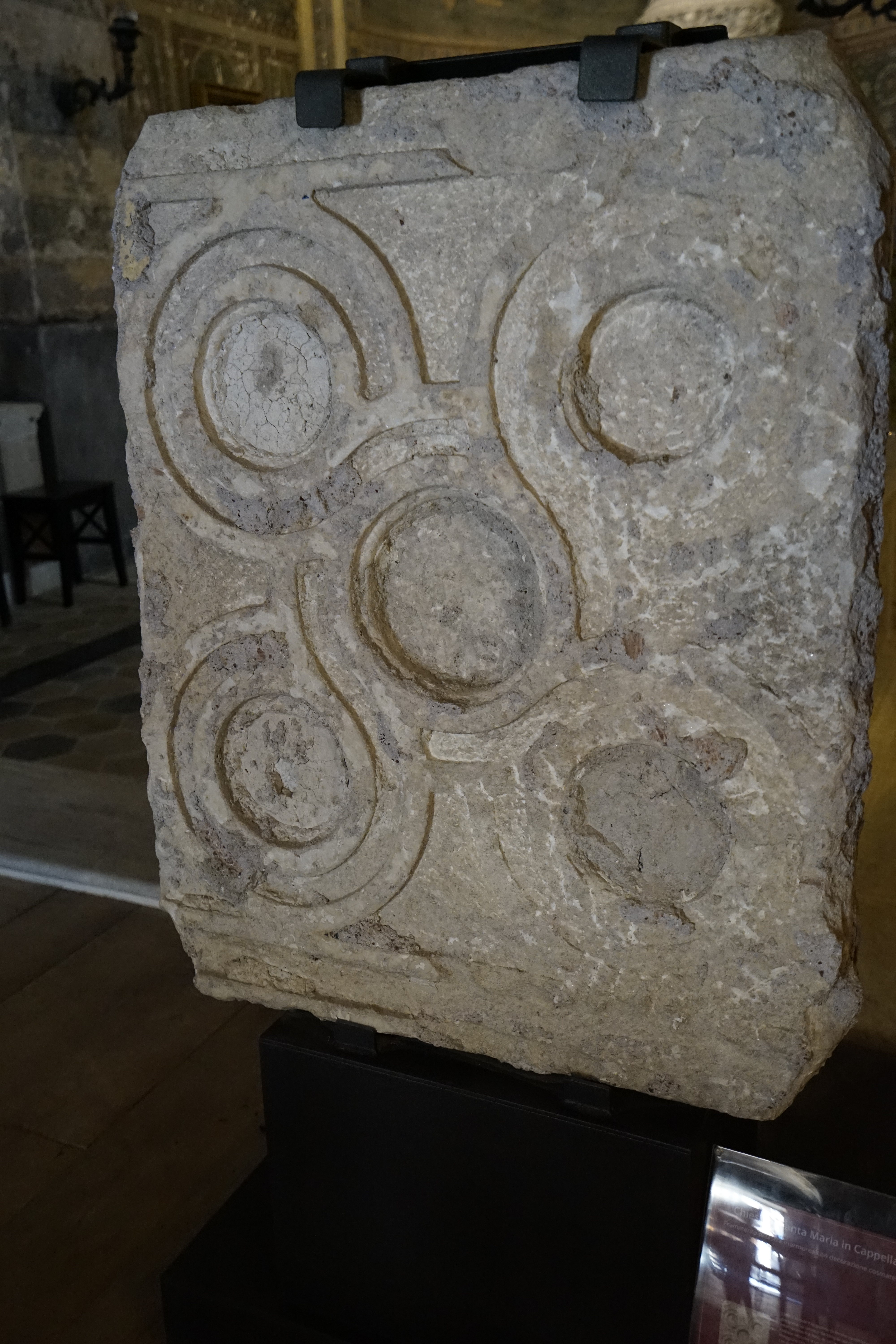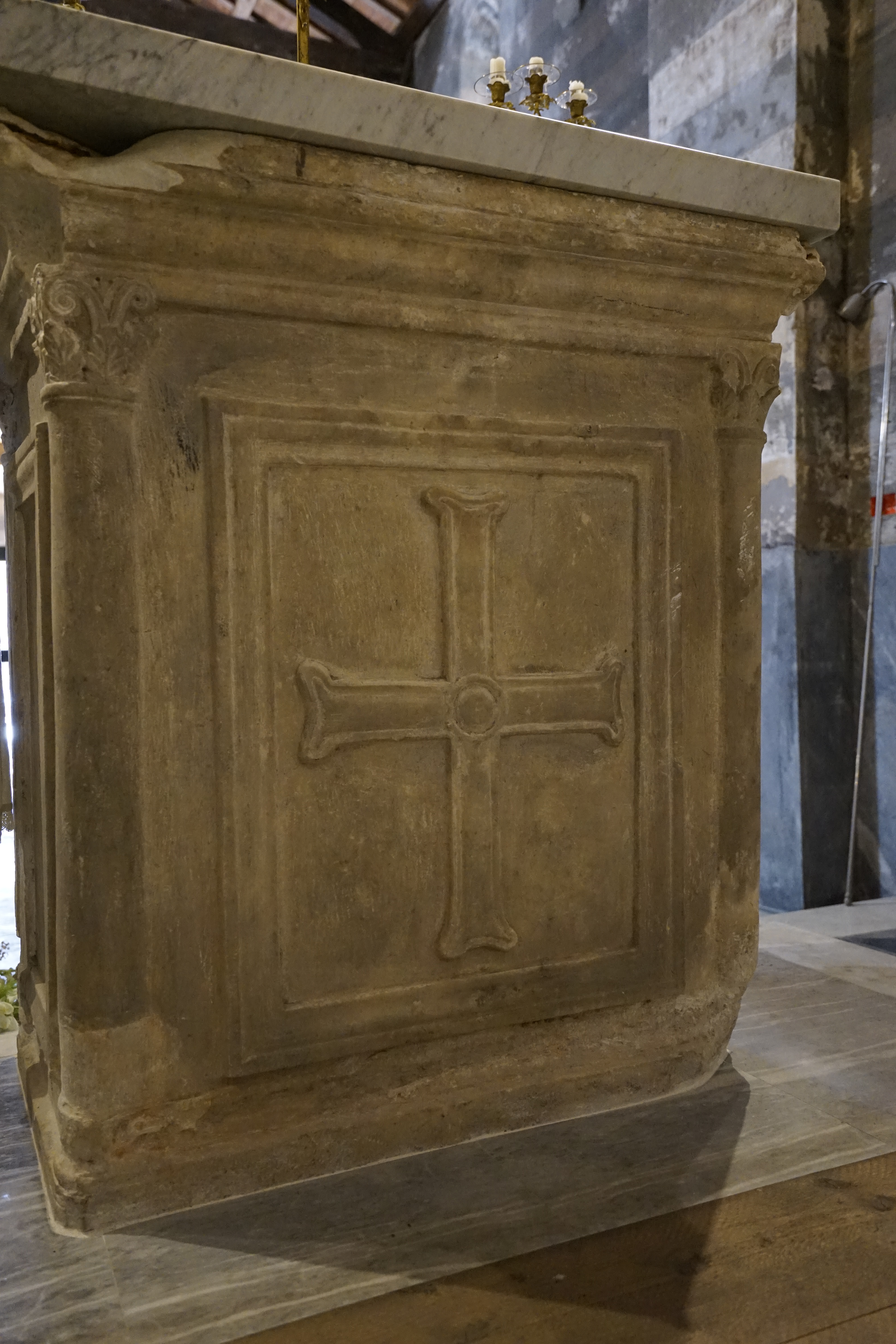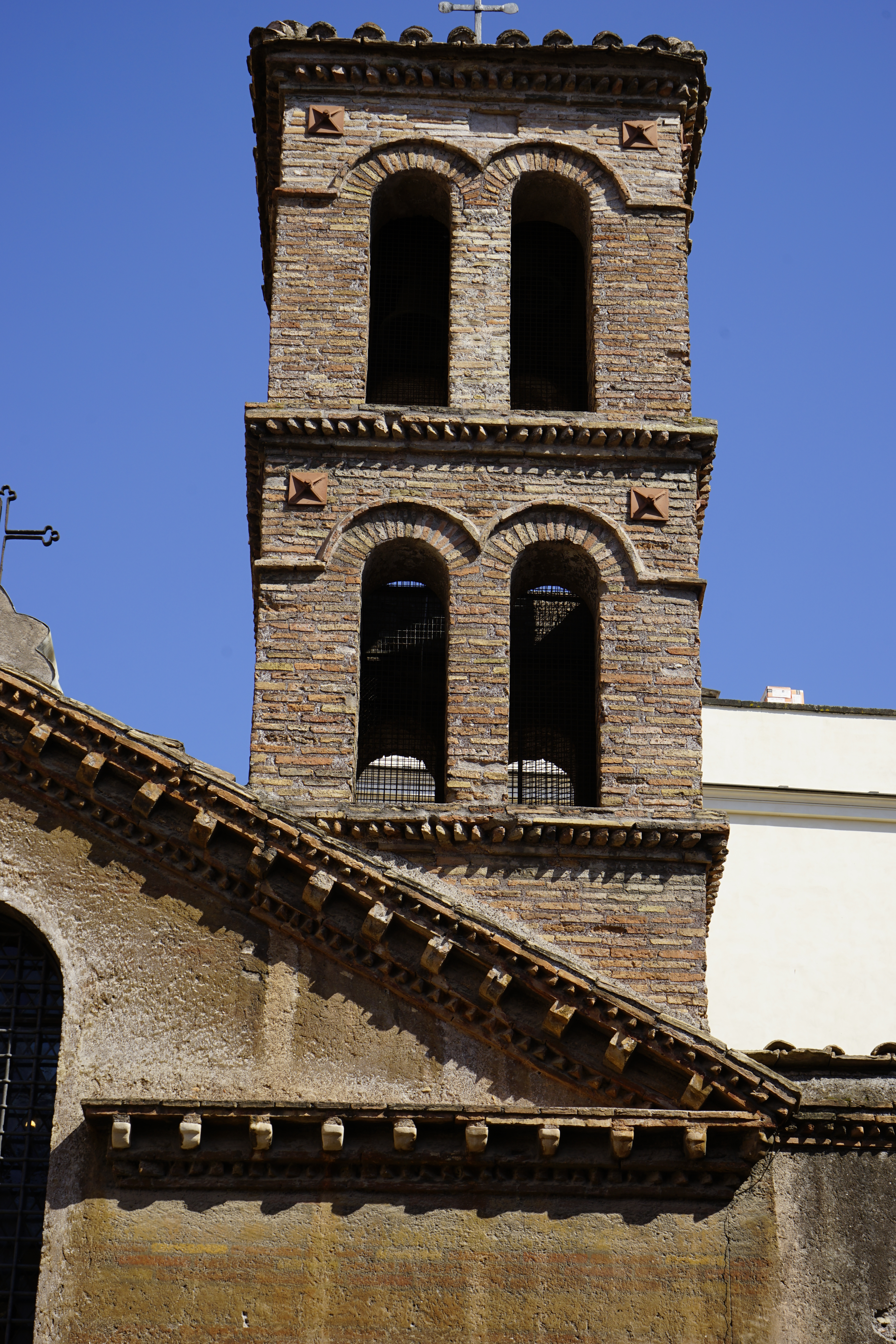 An epigraph mentions the consecration in 1090 by the reformed Pope Urban II of the main altar of the church which was called ad Pineam. In 1113, an inscription that is no longer preserved mentions the dedication of a side altar. The body of the nave was probably longer and the original apse to the east was possibly destroyed by an overflow of the Tiber. The current medieval appearance of the façade and the three-aisled interior with a choir and vaulted apse is largely the result of a historicist reconstruction of the church. Originally, the church had already been reduced in size in the medieval period and later converted to Baroque style. Significant parts of the two-storey bell tower, the façade and the outer wall of the southern clerestory are medieval, while inside, only the southern colonnade of the nave can be considered of the period. Among the liturgical furnishings that have been preserved are a slab with a quincunx of a pluteus, and a marble block altar attributable to the late 11th century with a clipeate Agnus Dei in relief on the front and small columns at the corners – a rare example of the art of the Gregorian reform prior to the building boom under Pope Paschal II.