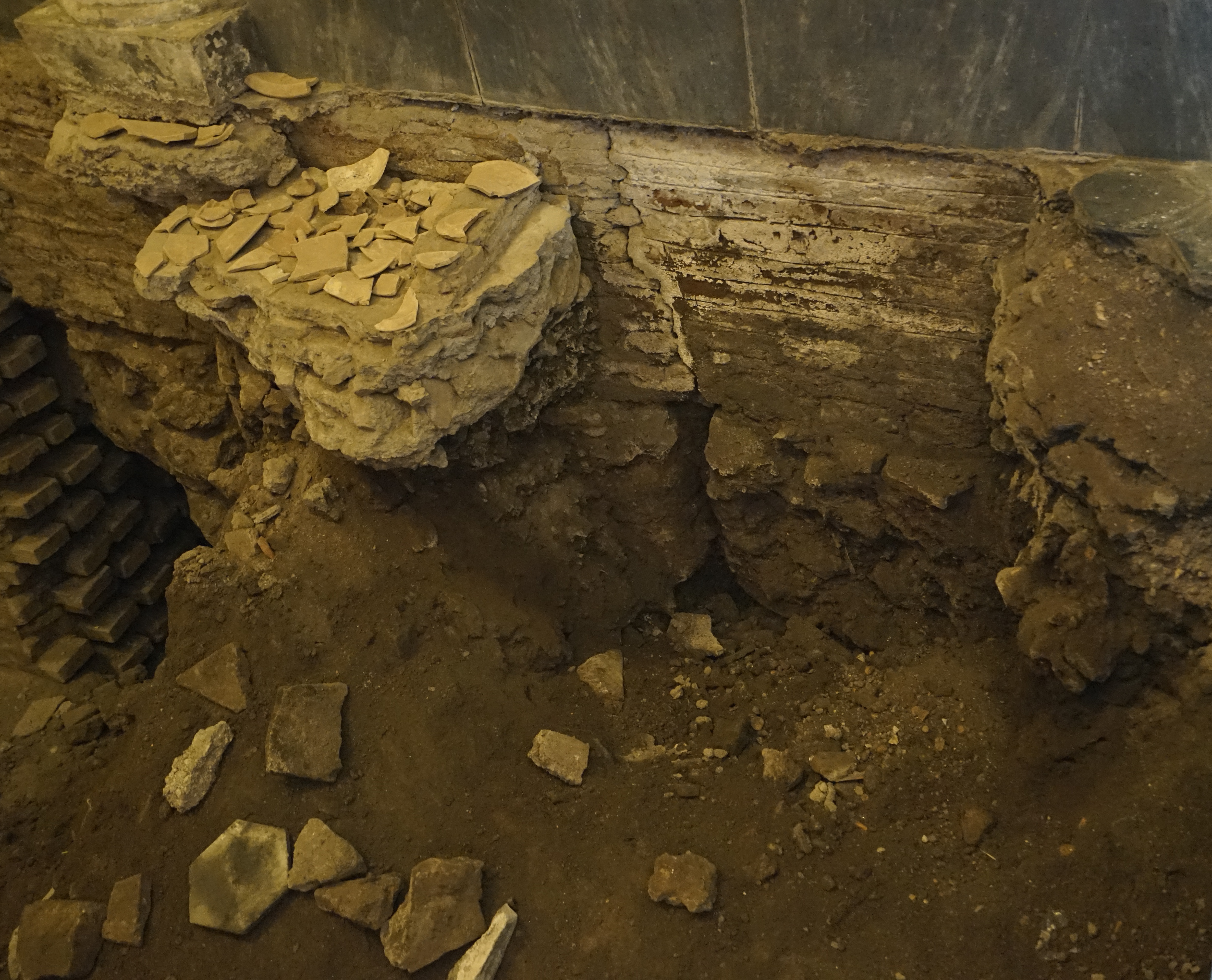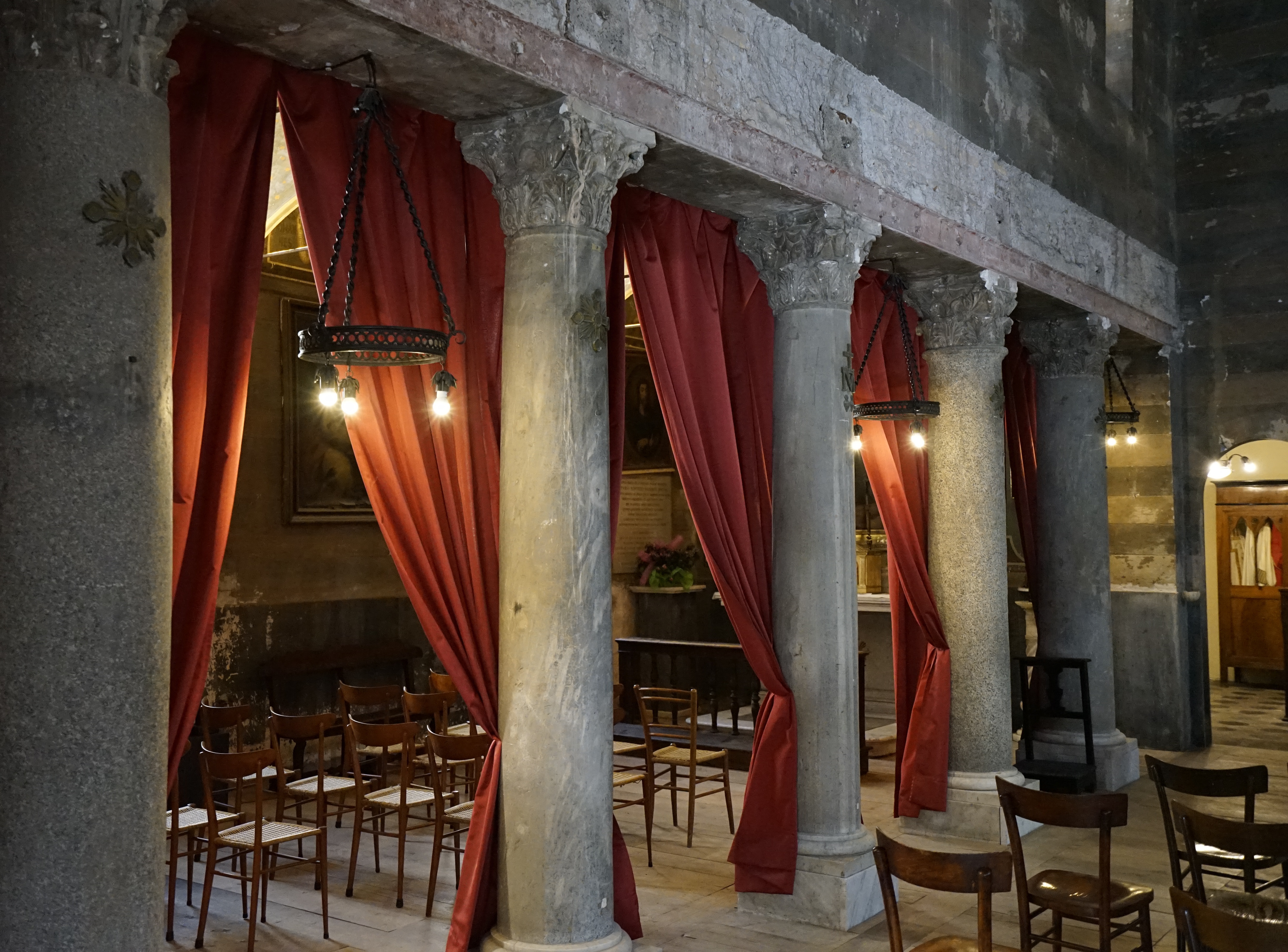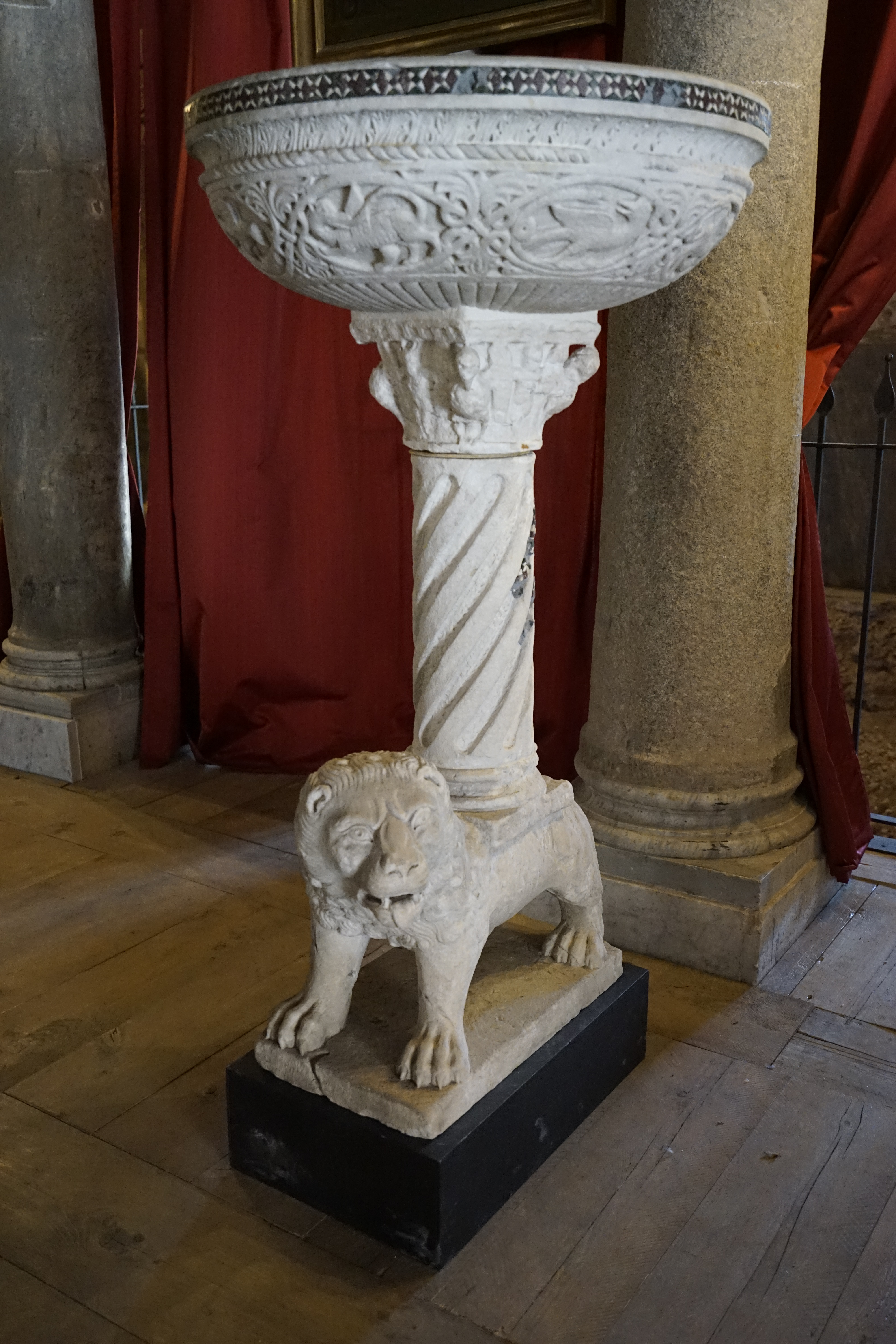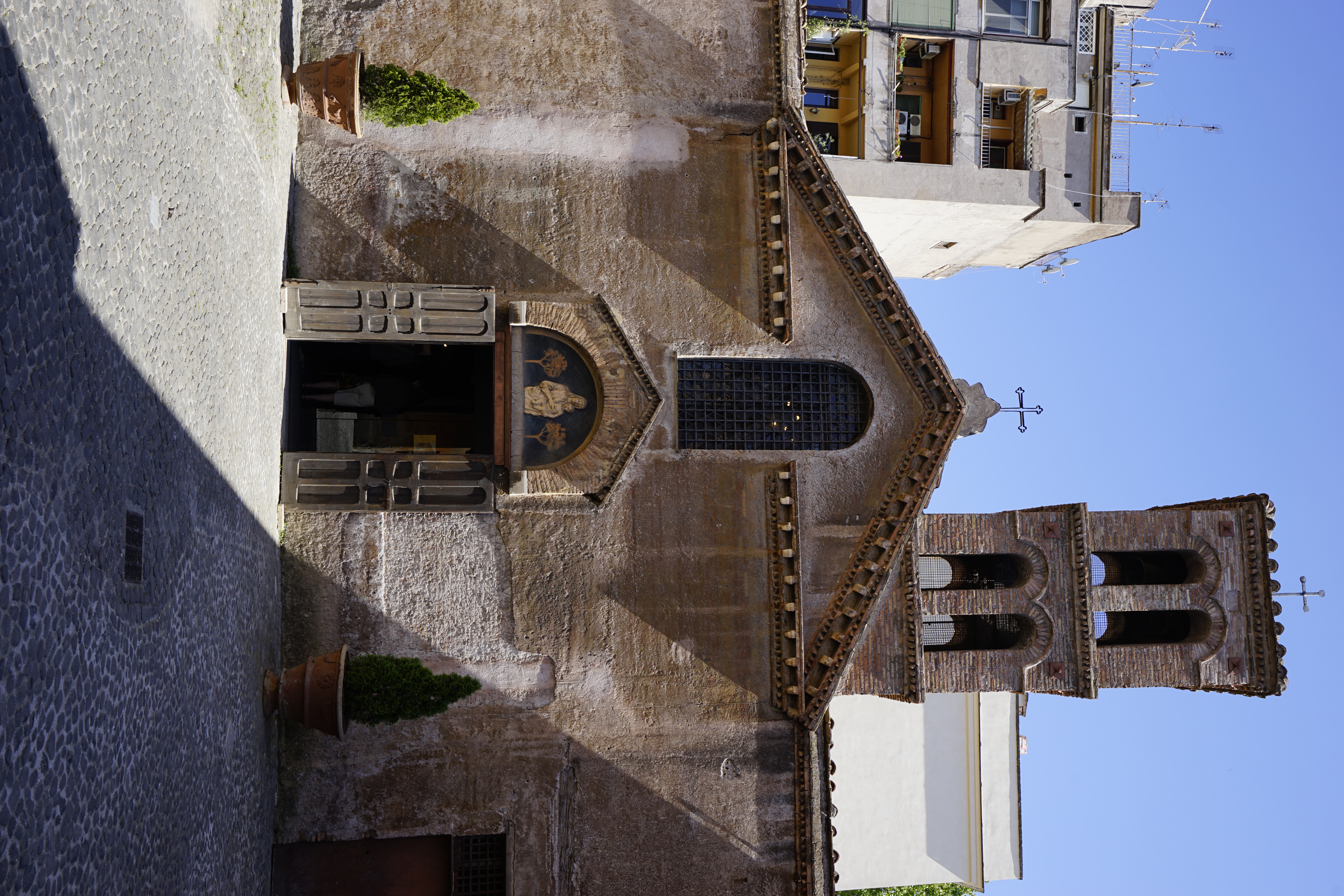 An epigraph mentions the consecration in 1090 by the reformed Pope Urban II of the main altar of the church which was called ad Pineam. In 1113, an inscription that is no longer preserved mentions the dedication of a side altar. The body of the nave was probably longer and the original apse to the east was possibly destroyed by an overflow of the Tiber. The current medieval appearance of the façade and the three-aisled interior with a choir and vaulted apse is largely the result of a historicist reconstruction of the church. Originally, the church had already been reduced in size in the medieval period and later converted to Baroque style. Significant parts of the two-storey bell tower, the façade and the outer wall of the southern clerestory are medieval, while inside, only the southern colonnade of the nave can be considered of the period. Among the liturgical furnishings that have been preserved are a slab with a quincunx of a pluteus, and a marble block altar attributable to the late 11th century with a clipeate Agnus Dei in relief on the front and small columns at the corners – a rare example of the art of the Gregorian reform prior to the building boom under Pope Paschal II.