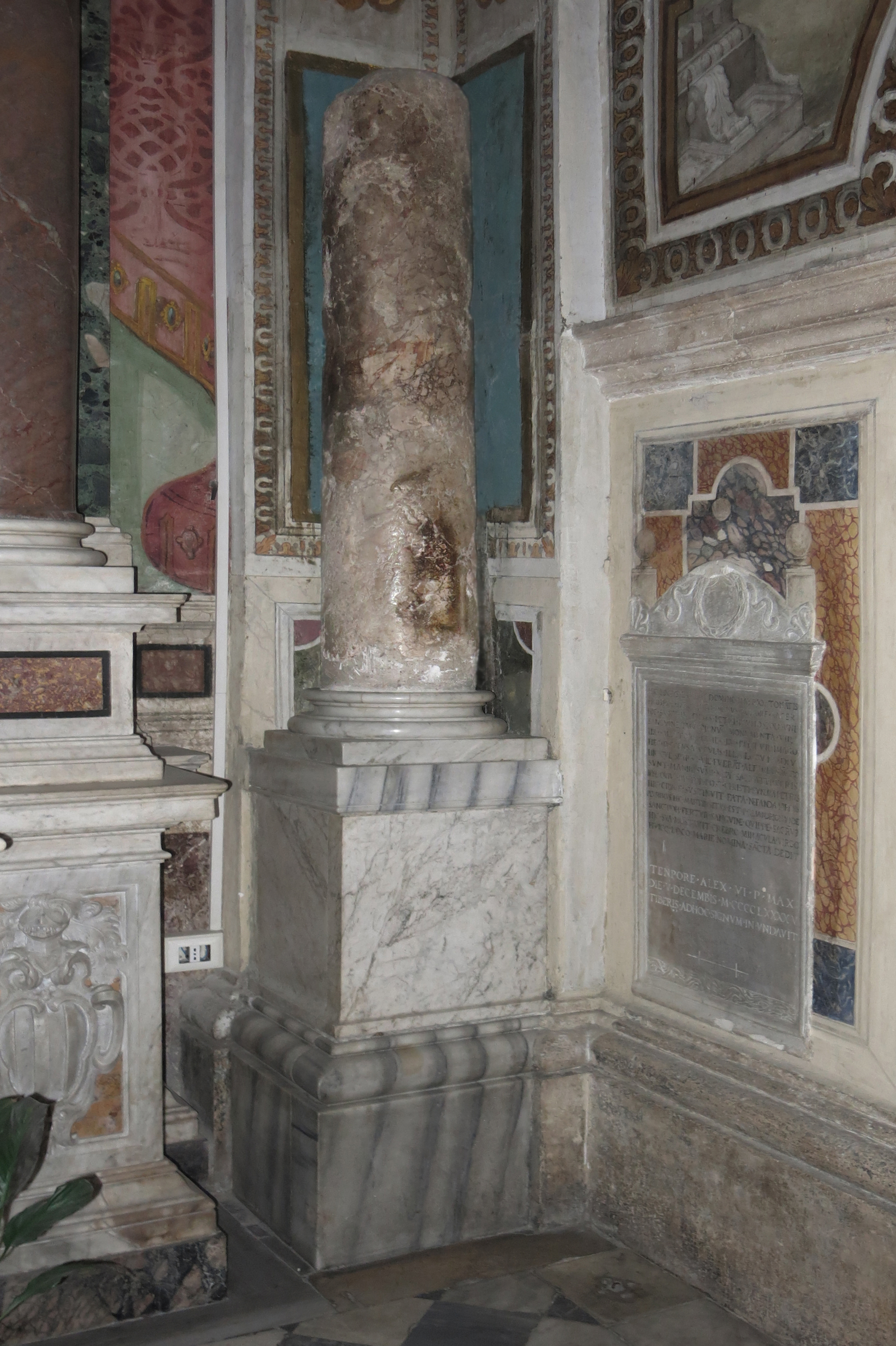 Today's church of the same name (a baroque building on Via della Conciliazione) has little to do with the previous church, which was located south of Castel Sant'Angelo until 1570. No trace remains of the small west-facing three-aisled basilica with its own bell tower. We do not know whether the building founded as a diaconia by Pope Hadrian I (772-795) dates to the 8th/9th century or to the 12th century. A record from 1194, documenting the deposition of relics in the altar by Pope Celestine III, suggests a possible updating of the liturgical furnishings, while an inscription from 1277 may refer to work on the façade. The columns of the Scourge of Peter and Paul positioned nearby, on the route from the Tiber Bridge to St Peter's, gave the church a certain importance as a place of pilgrimage and in the ceremonial coronation of emperors.
