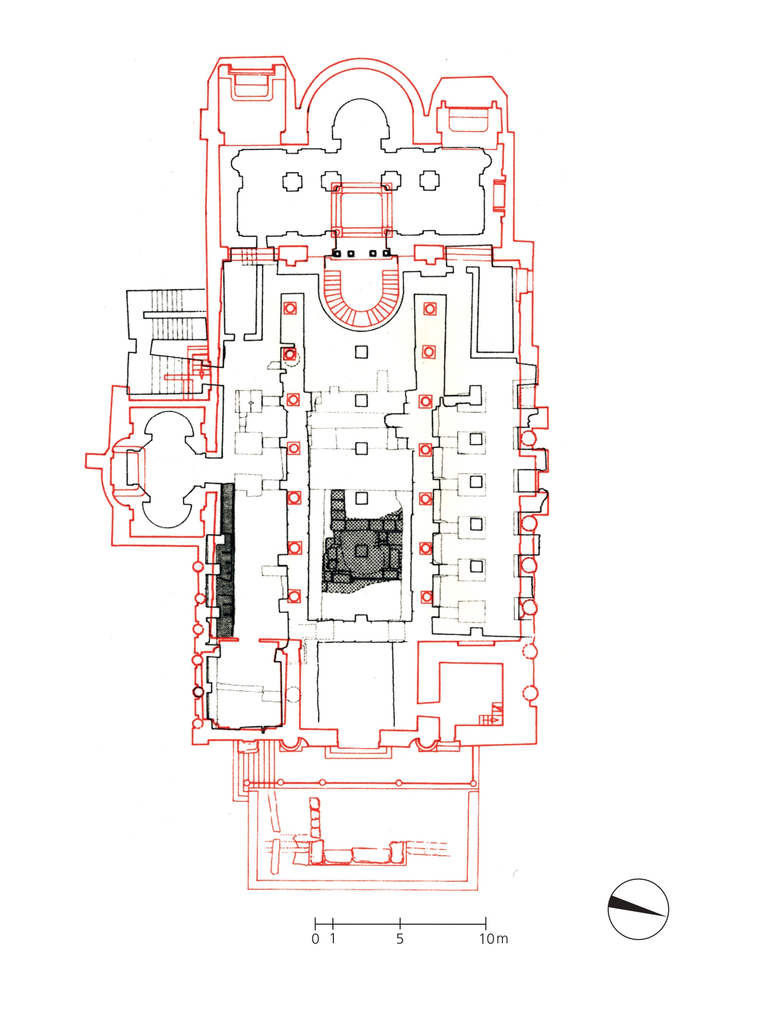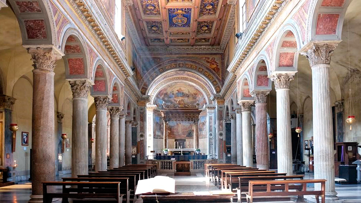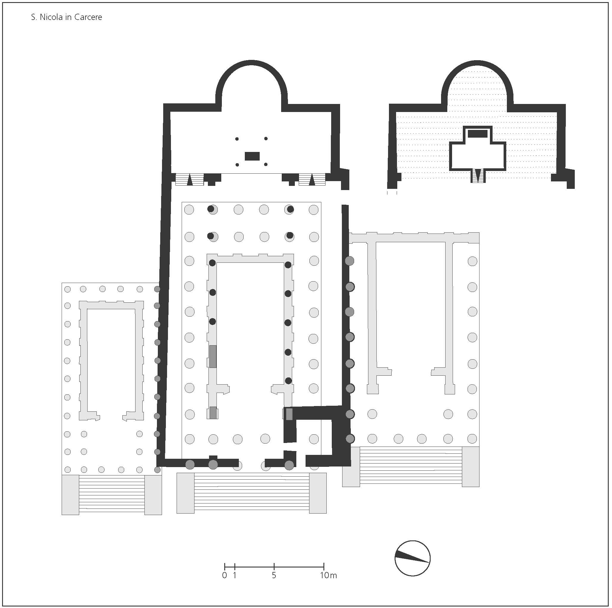 It was generally believed that S. Nicola in Carcere was built around 1128. However, the core of the current plan of S. Nicola may date back to the years of Pope Urban II (1088-1099). During the construction, spolia from three ancient temples were used, integrating columns and parts of the walls of the ancient cella left in situ into the church building. It can be assumed that these temples were first converted into churches in the Early Middle Ages. The transept and crypt date back to the time of Urban II, modelled on the abbey church of Montecassino. The dedicatory inscription of 1128 may not refer to a new construction of the church of S. Nicola, but rather to the completion of a new decoration. It can therefore be assumed that the consecration of 1128 perhaps only referred to the addition of new furnishings, as happened in other churches in the 12th century. Inside, a floor, liturgical furnishings and frescoes in the crypt were probably added; there was also perhaps a slight shift of the four columns near the presbytery towards the aisles to make room for a presumed schola cantorum. The 13th-century interventions under Giovanni Gaetano Orsini (1244-1277) include a Gothic side portal and probably a rose window. The current appearance of the building results mainly from extensive 19th-century restorations.